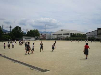 本日の縦割り遊びは、ドッチビー、ケイドロです。5つのグループの1〜6年生が楽しく遊んでいます。