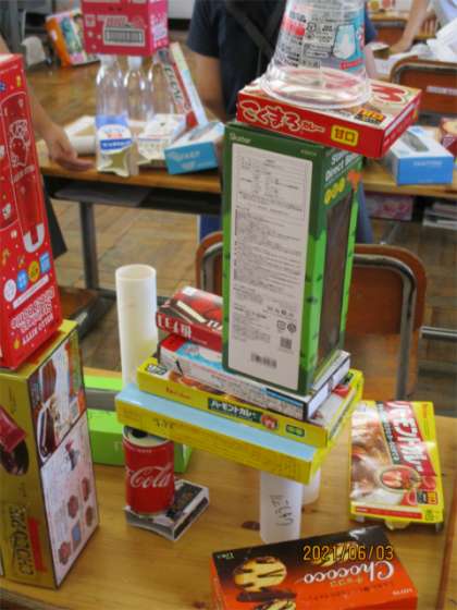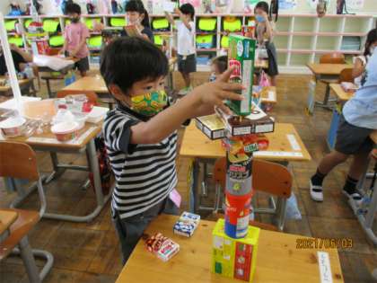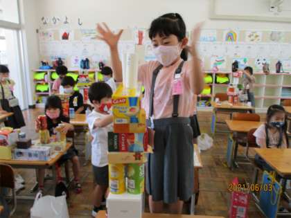 いろいろな箱や缶を使い、動物や乗り物など、その特徴を生かした作品ができあがりました。みんな夢中で組み立てていました。