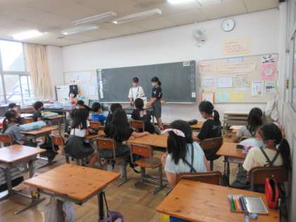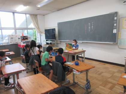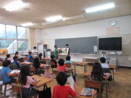児童会主催の高学年による読み聞かせが行われ、1年生から3年生までの各教室で、ロング休憩時、みんな静かに聞いていました。