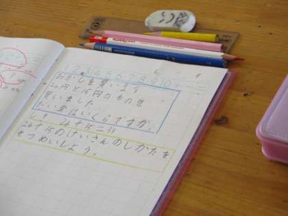 (下)2年生の算数ノートです。問題は青線、めあては黄線で囲んでいます。定規を使って引いているので、きれいですね。