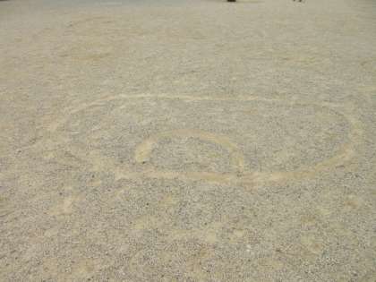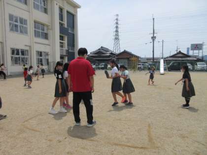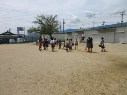 いつものように元気に外遊びをしました。地面に何か人の絵が描かれています。ある先生の絵らしいです。