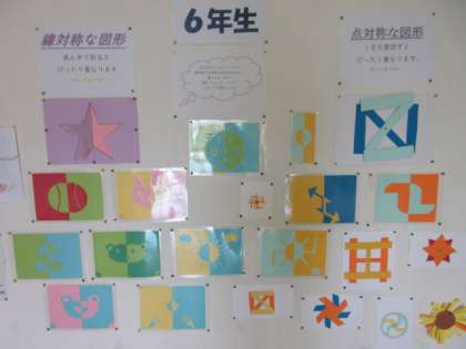 6年生の学習内容で、線対称・点対称を掲示しています。他の学年の児童たちも、じっくりと見ています。