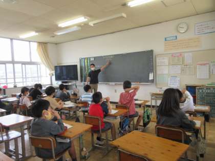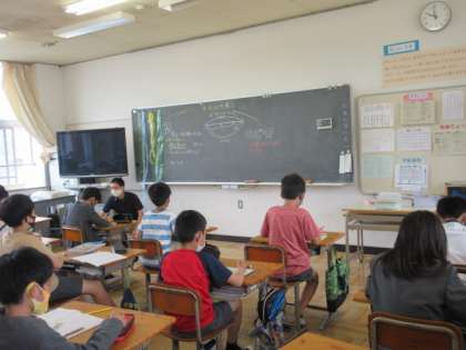 5年生の様子です。算数の時間。みんながんばって図の説明をしようとしています。