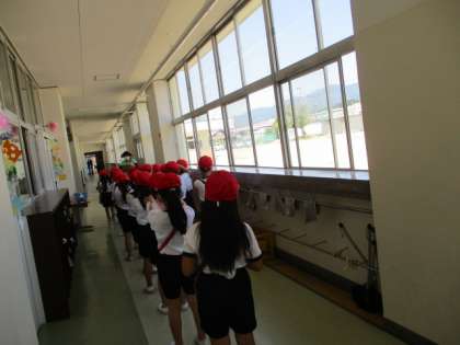 移動のため1年生は、廊下にまっすぐに整列しています。入学して2か月、ここまで成長しました。