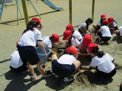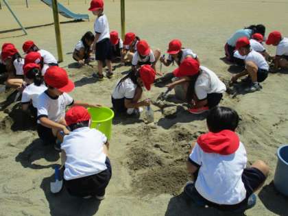 砂場では、山を作ったり、川を掘ったり、水を運んだりと協力していました。暑い日でしたが、夢中になって作っていました。