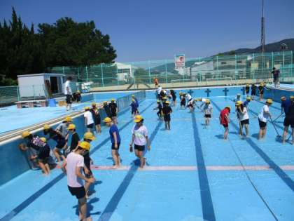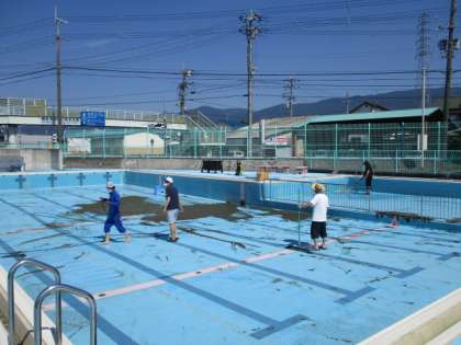 (上)2年ぶりのプール掃除です。学校運営協議会や共育コミュニティの方にお世話になり、機械を使って大量の藻を押し出していただきました。