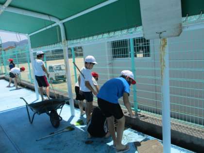(中)5年生がプールの外回りの掃除をしました。溝や排水溝に泥が溜まっていましたが、一生懸命に掃除してくれきれいになりました。