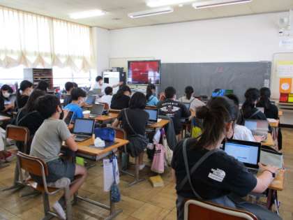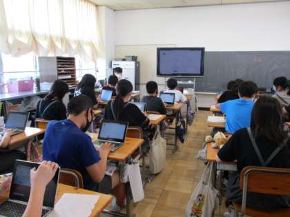 タブレットを使っての学習です。「ミライシード」にあるカードに名前等を書いて、カードとカードをつなげていました。難しいところはお互いに教え合ったり大画面で確認したりして、進めていました。