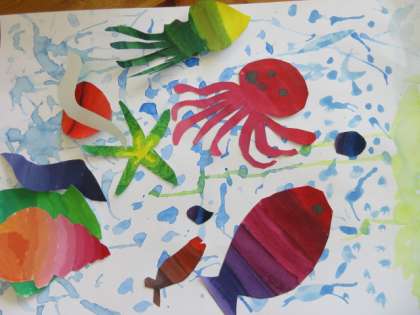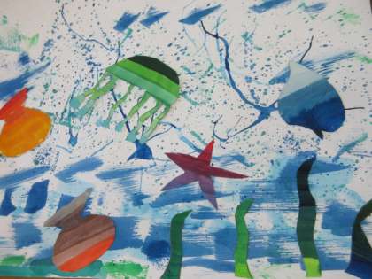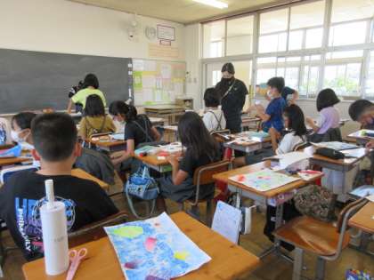 6年生の様子です。図工の時間、海の様子の楽しい絵が出来上がってきました。
