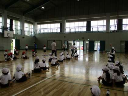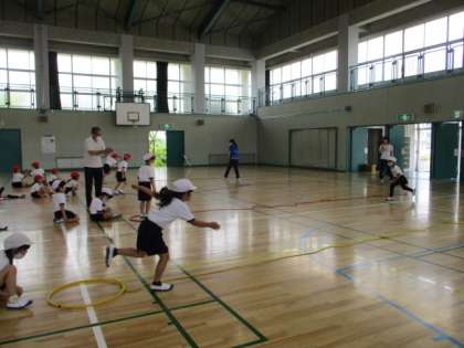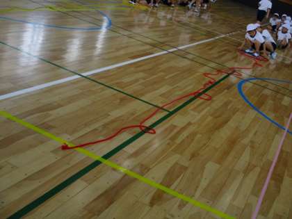 1年生が体育館でかけっこをしていました。グループで相談して、ひもで○を作ったり、くねくねコースにしたりと、オリジナルのコースができあがりました。自分たちで考えたコースなので、どの子も楽しくかけっこしていました。