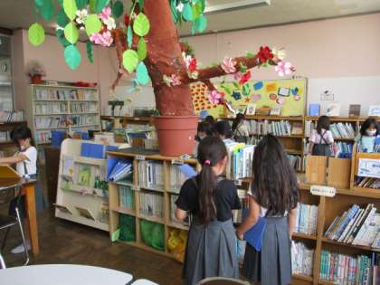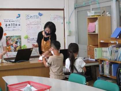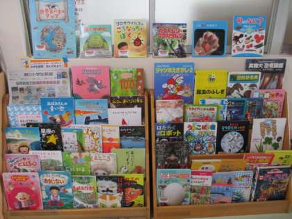 図書館司書が来てくれ、ブッキーから新しい本を借りて並べてくれました。お化けの話や夏のお話の本がたくさん並んでいます。