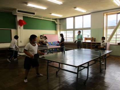 (下)卓球クラブ 気合を入れて試合をしています。試合に出ていない子は、ラリーの練習をしています。