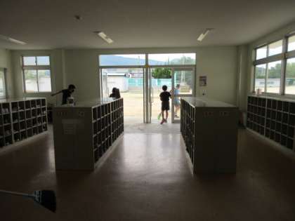児童玄関前の掃除です。今日は土でいっぱいでしたが、綺麗に掃きだしてくれました。