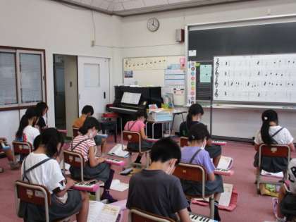 音楽の時間に「楽しいマーチ」の曲を鍵盤ハーモニカや縦笛で演奏しました。音を出すときは出し、休符で音を出さないというめりはりがあり、そろっていてきれいでした。