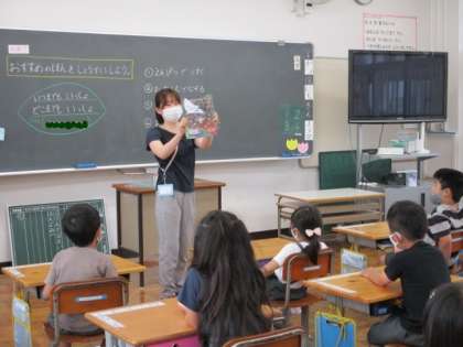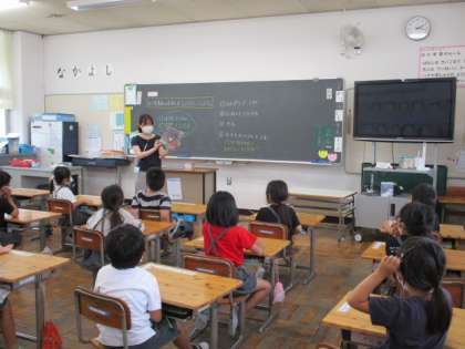 自分の読んだ本の中で「おすすめの本」を読書カードに書いて、知らせる活動です。先生から今年の課題図書の紹介もありました。