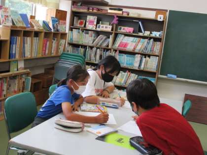 (上)図書委員会では、掲示用の「おすすめの本」紹介のポスターづくりをしていました。自分のお気に入りの本を書いていました。
