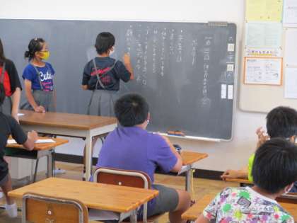 (下)体育委員会でも、ポスター作りでした。きまりを守って水泳をするために、「サンダルをそろえる」「体操をしっかりする」等のフレーズがあがっていました。