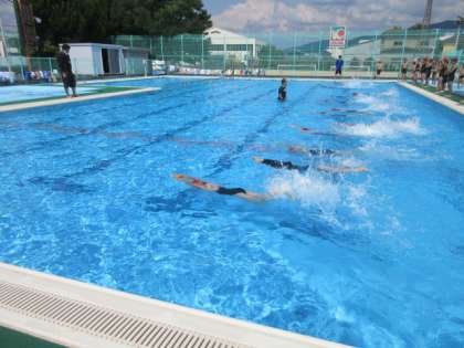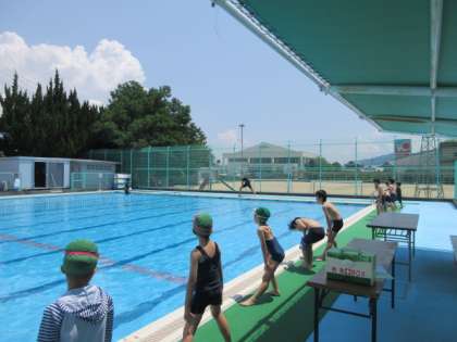 本日のプールの様子です。曇り空から晴に変わり、いいコンディションでの授業となりました。楽しみながら、上達できるようがんばろう。