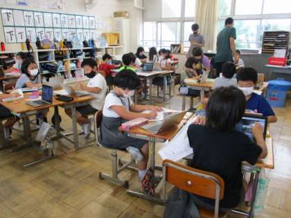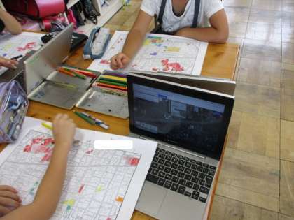 社会科の土地利用の様子をタブレットを使って調べていました。前回よりも色塗りをしている場所が増えていました。