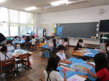 (下)図工では、雨の季節にぴったりのレインコート作り。青いビニールぶくろにマジックで模様を描いていました。この後飾りを貼るようです。どんなレインコートが出来上がるのか楽しみです。