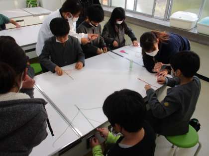 本日、放課後ふれあい教室がありました。3年生が組紐でミサンガを作りました。鬼滅の刃にちなんだ色のミサンガです。子供たちは自分の好みの登場人物の色を選んでミサンガを作りました。