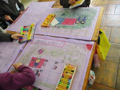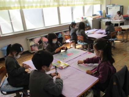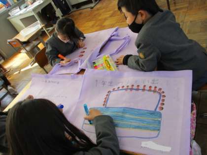 1年生は、作品ぶくろを作っていました。思い思いにペンやクレパスで描いていました。