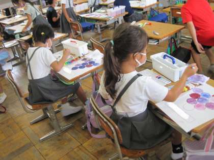 1年生は、赤と青の色まぜの勉強をしました。赤が多いと、赤っぽい紫色になります。美味しそうなぶどうの絵が完成しました。