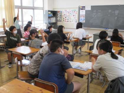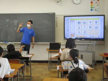 英語の時間の様子です。ミッシングゲームをしながら、発音や意味を学びました。表示された様子を表す画像のうち、何枚か消えたものが、どの言葉なのかを当てるゲームです。