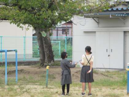 6年間過ごした小学校の思い出に残る場所を見つけ、最後はタブレットで撮影しました。