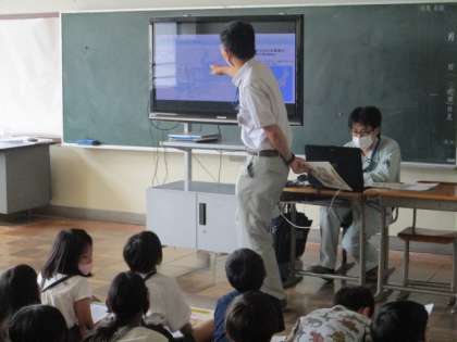 今日の3・4時間目に浄水場から2名の方に来ていただき、浄水場でどのように水をきれいにするのか、また、各家庭に水がどのようにして届けられるかを教えてもらいました。