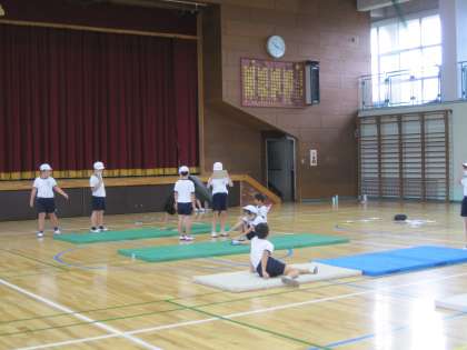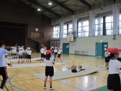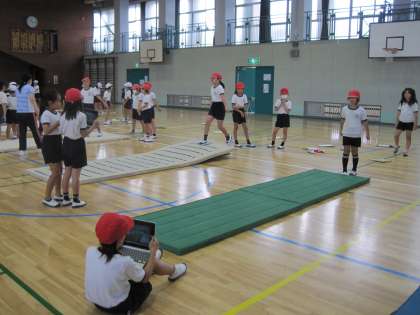3年生は、マット運動をしていました。タブレットで撮影して、友達からアドバイスをもらっていました。