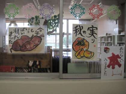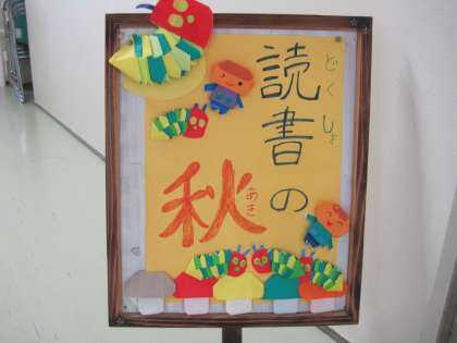 図書室の飾りが秋バージョンになりました。図書館司書や図書ボランティアの方々で作っていただきました。図書室に入るのが、わくわくします。