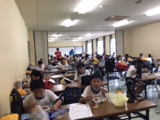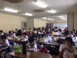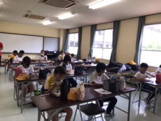 5年生は、冷房のきいた部屋で、お家の方に作っていただいたお弁当を美味しくいただいています。