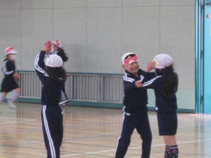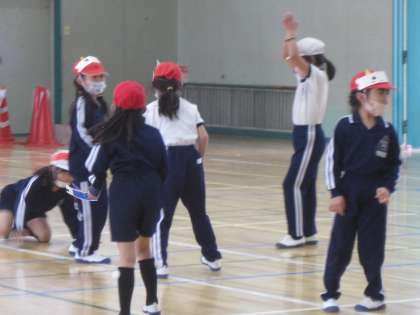 1年生の体育では、バナナ鬼ごっこを行いました。タッチされるとバナナになるのです。また、助けられると、皮がむけて鬼ごっこに戻れるのです。