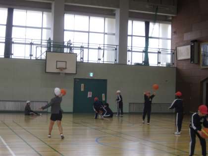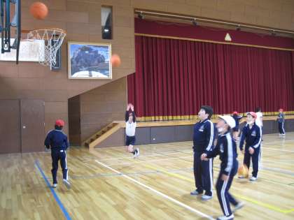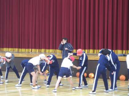 開始前から、バスケットボールを練習していました。チャイムが鳴るとまずは、体ほぐしから始めました。