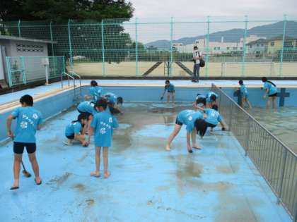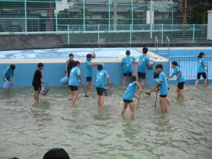 雨がちらつく少し寒い中でしたが、どの子も元気いっぱい体を動かし、プールの中を掃除してくれました。プールの壁面が藻や汚れがたくさんありましたが、一生懸命たわしを使って汚れを落としてくれました。また、バケツを使って、抜けきれない水を何度も出してくれました。