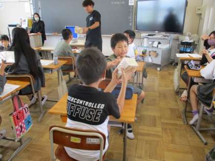 税金の必要性をDVDを使いながら分かりやすく教えていただきました。また、税の種類や1億円や1千万円がどのくらいの量なのか、レプリカを使いながら体験させてもらいました。子供たちは、驚きながら体験することができました。