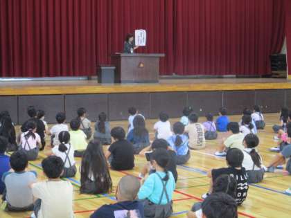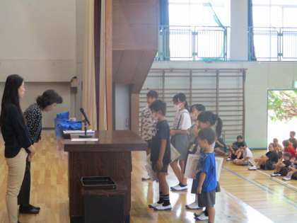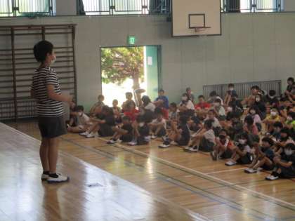 校長先生の話の後、よい歯のコンクールの学年代表の紹介と表彰、よい歯のポスターの入選者の表彰を行い、代表委員会から地域や学校でしっかりあいさつするよう呼びかけてくれました。そして、最後は、体育委員会から水泳の授業での約束について、劇と○×クイズ形式で説明してくれまし。