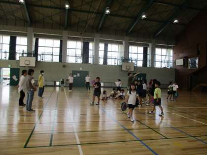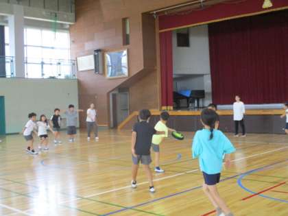 体育館でフリスビーを使ったドッジです。元気いっぱい体を動かし楽しみました。