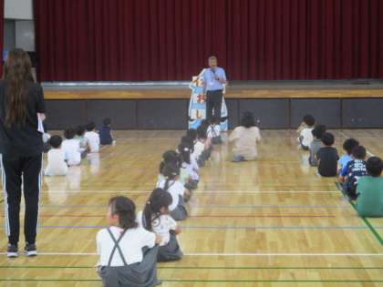 訓練終了後に1から3年生は、体育館で青少年センターのお話を聞きました。「いかのおすし」について、具体的な例をあげながら丁寧に教えていただきました。また、4から6年生は、放送で学校の中での避難の約束や「いかのおすし」について、説明しました。