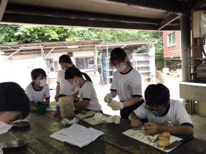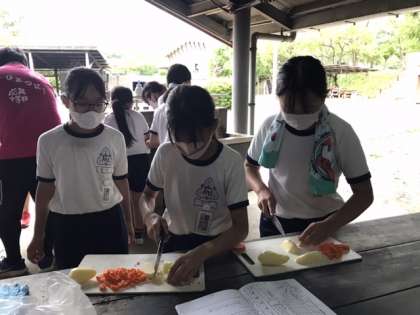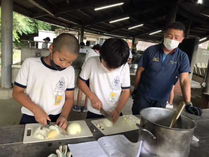 いよいよお楽しみのカレーづくり。玉ねぎを包丁を使って切るのは、はらはら。じゃがいもやにんじんはピーラーで手際がいいです。