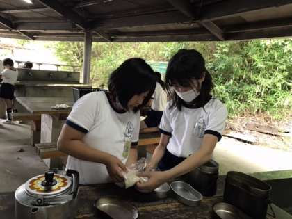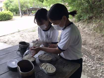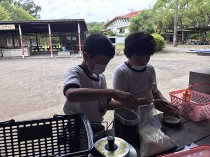 お米は飯ごうで炊きます。3号、4号を測るのを慎重にしています。くふ