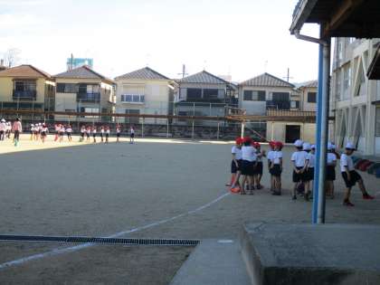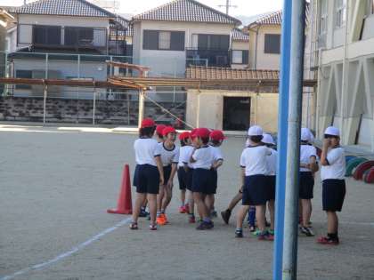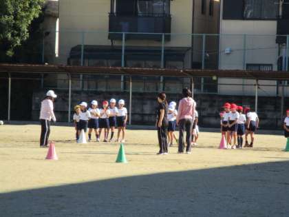 「走の運動遊び」では,「 いろいろな方向に走ったり, 距離を決めてはしったりすることができる。運動に進んで取り組み, きまりを守り仲よく運動ができ、場の安全 に気を付けたりすることができるようにする。走りをとおして、簡単な遊び方を工夫できるようにする。」ことを目的に活動しています。