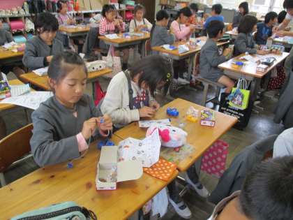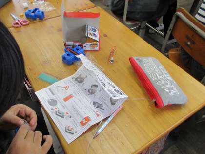 実験のために、豆電球セットの組み立てをしているところでした。設計図とにらめっこしながら、ビニール線の皮をむいて実験用セットをしっかり組み立てていました。