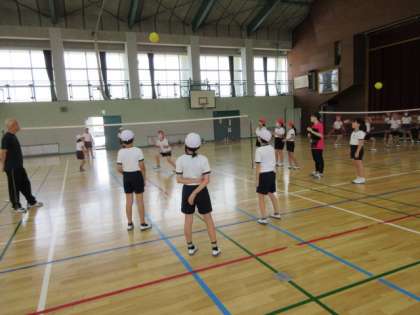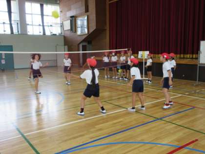 4年生は、体育館でキャッチバレーボールをしています。