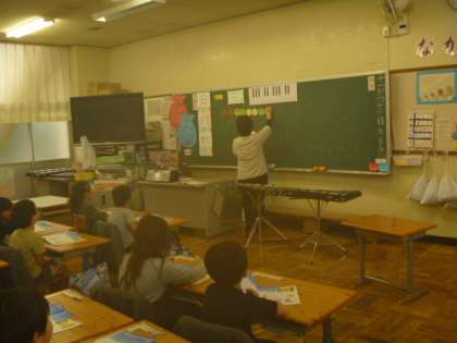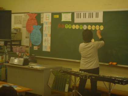 「ドド ソソ ララ ソ・・・・・」を貼ってもらい、みんなで楽しく音階読みをしていました。その後は、鉄琴をたたいて・・・・。