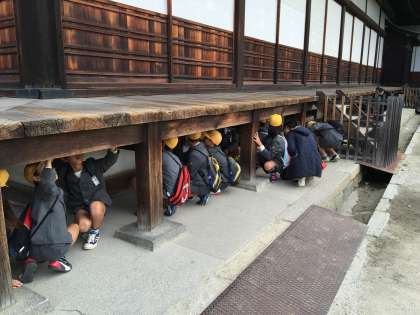 鶯張りの廊下も歩きました。鶯張りの仕組みも教えてもらいました。(写真 下)