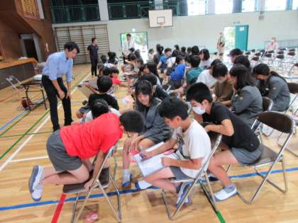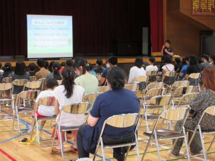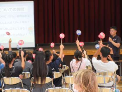 今日の5時間目に、紀和病院より梅村先生に来ていただき、がんについて、事前に質問したことなど、いろいろ教えてもらいました。基本的な生活習慣や適度な運動等、身近な習慣が大切であることを知りました。また、しっかり検診を受けることの大切さについても教えてもらいました。