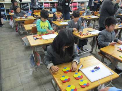 子どもたちが、意欲的に取り組むための仕掛け(教材・教具の工夫 パターンブロック・タブレットなども活用)も考えながら進めています。