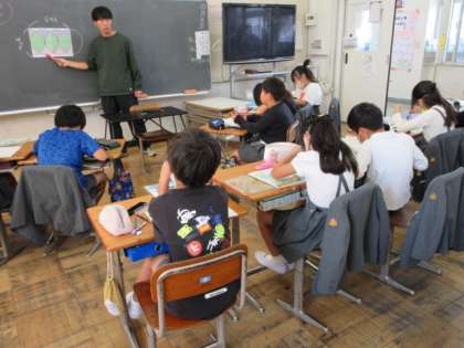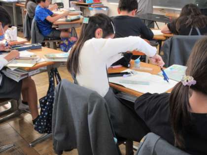 コンパスを使って模様づくりをしています。複雑な形で円の中心が見え行くものもありましたが、何度もチャレンジしながら、完成させていきました。